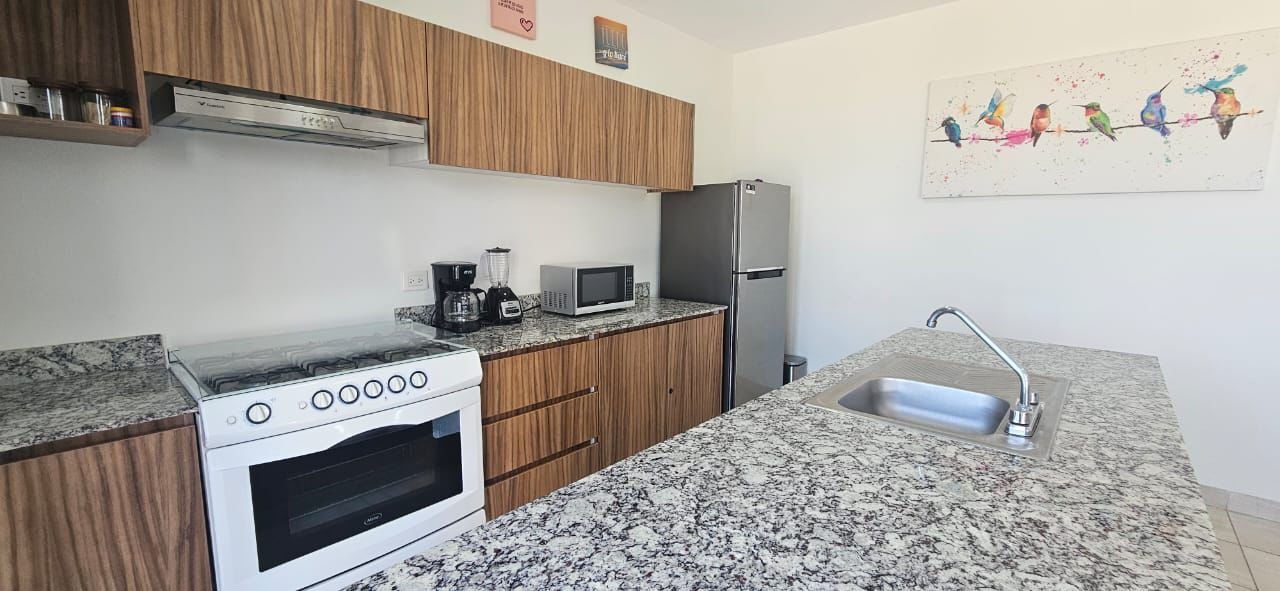 Sala – Comedor – Cocina amueblada y equipada con estufa y campana.