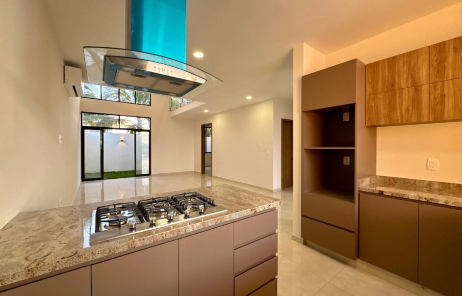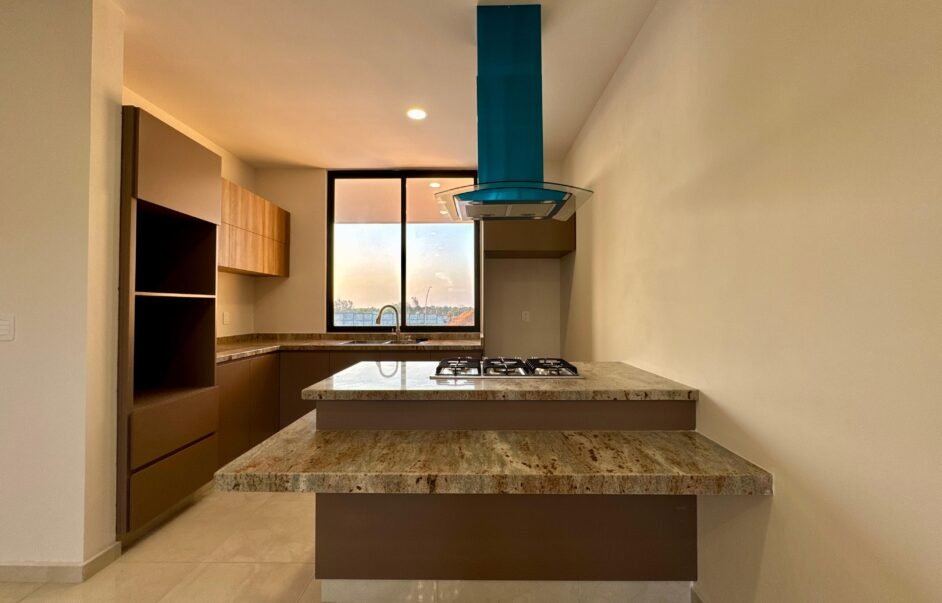 Cocina integral con cubierta de granito, parrilla, campana, torre para hornos y barra desayunador