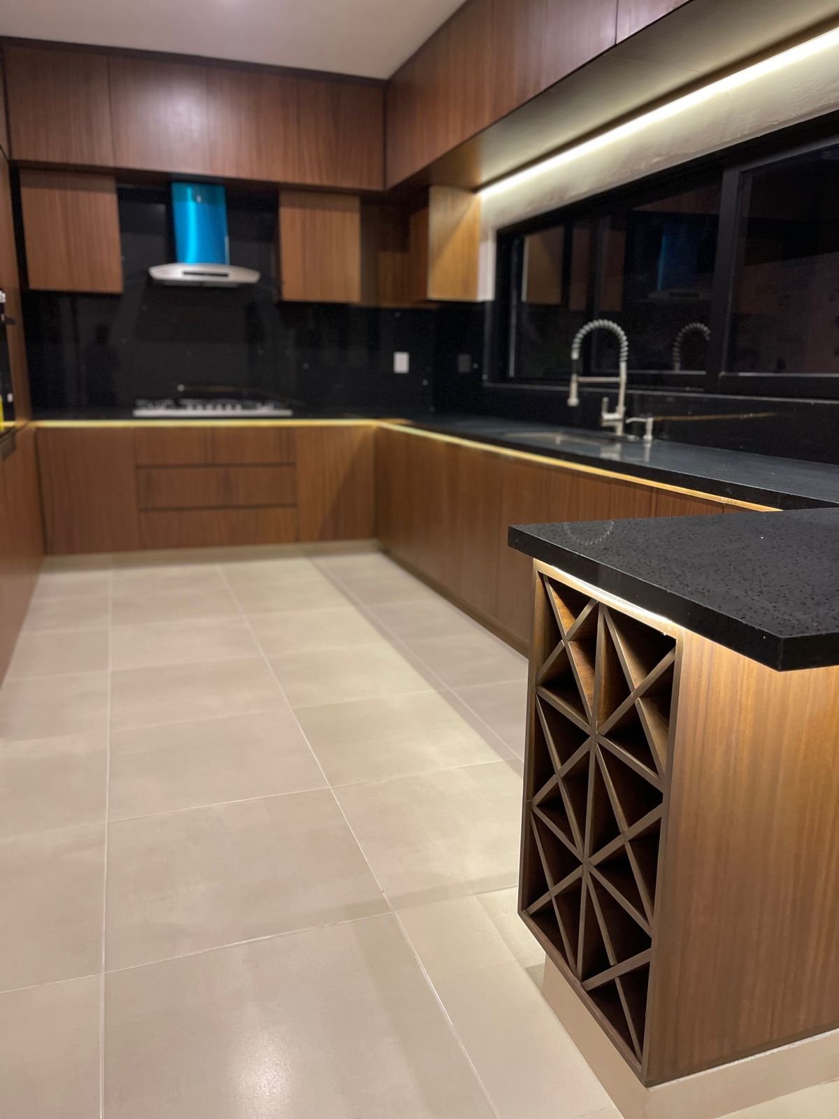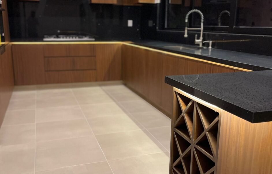 Cocina equipada con horno parrilla, campana y barra desayunadora