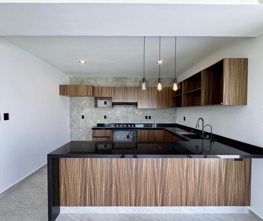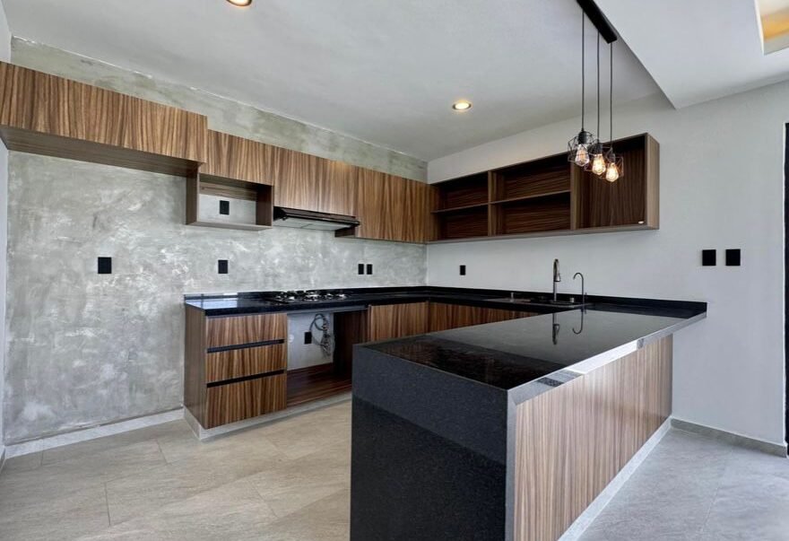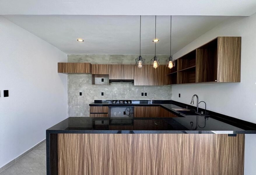 -Cocina integral con con cubierta de granito, parrilla, campana y barra -desayunador